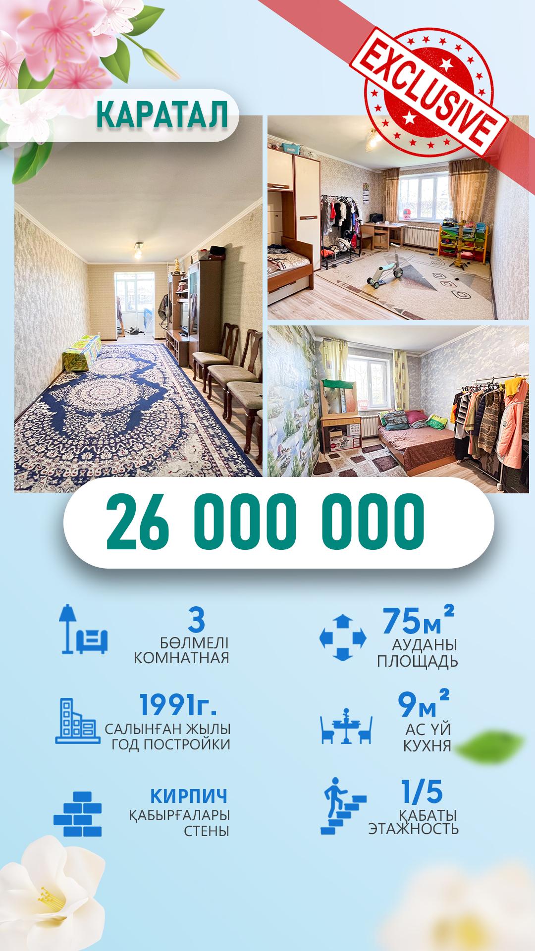 3-комнантная, 1/5 этаж, 74.8м², Каратал