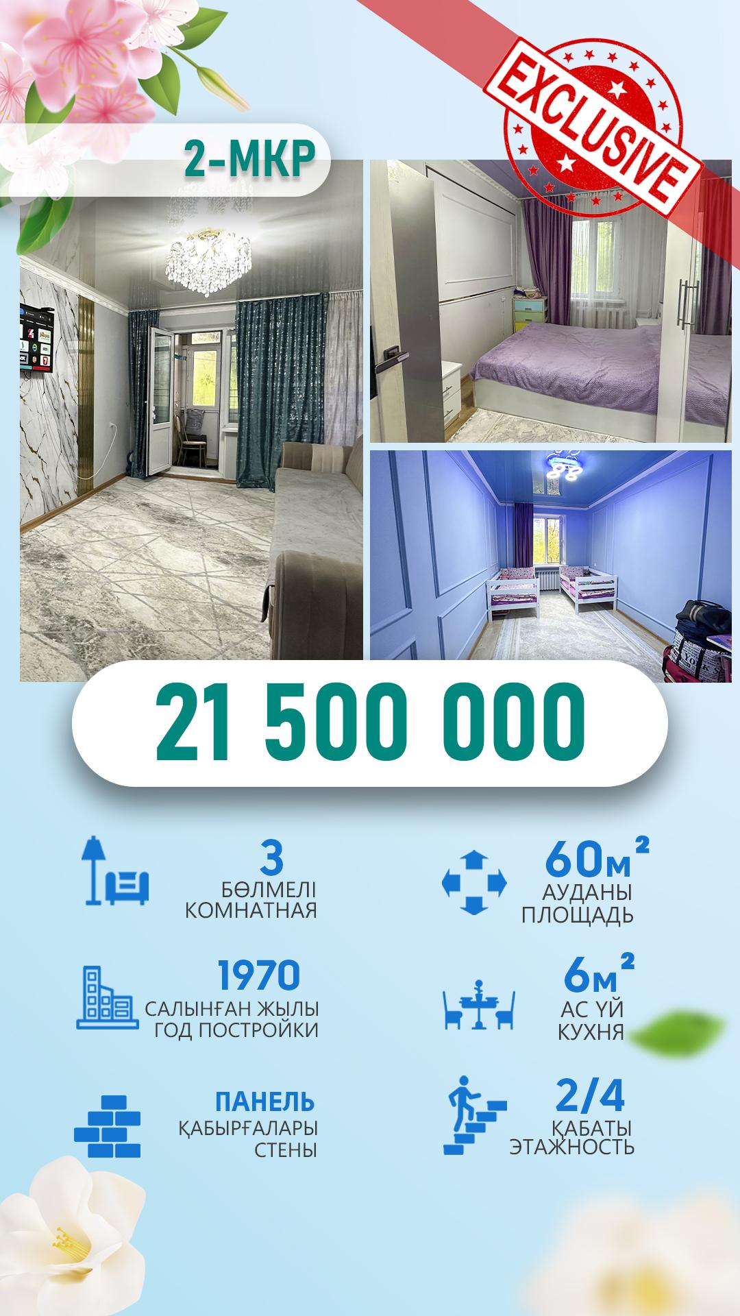3-комнантная, 2/4 этаж, 60.0м², Кабанбай Батыра